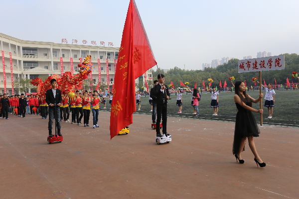 踩着慷概激昂的节奏,迈着矫健的步伐,国旗班的旗手们护卫着鲜艳的五星红旗和校旗首先入场,飘扬的红旗、缤纷的彩旗、灿烂的鲜花,喝着嘹亮的口号,各运动员方队依次走过主席台。舞动的龙狮展现的是城建健儿的豪情,温婉尔雅的古典舞蹈是新法学子低调奢华的助威,机灵卖报的小神童将新法院未来的传媒人角色展现的淋漓尽致,不断变换风格的舞蹈是机电运动员速度与反应的考验,各种科技产品的展示是信科学子实践能力的体现,独俱匠心的奥运五环展现艺设运动员“更高,更快,更强”的精神,各院系啦啦队摇旗呐喊助威声震全场……
