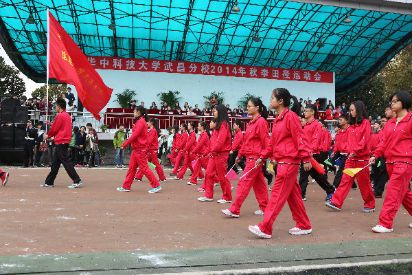 庄严的升国旗仪式后,周进校长致开幕辞。她说,体育不仅可以强身健体,还能锻炼人的意志,学校历来重视体育发展,并取得了优异成绩。2013年,湖北省普通高等学校大学生体育舞蹈锦标赛,我校国标队16人赴赛斩获十冠,成绩创历史新高;2014年,定向越野队成绩卓越,在湖北省第十一届大学生定向越野比赛中收获5金3铜,在第十四届湖北省运动会定向越野比赛中,更是斩获4金4铜,蝉联男女总分第一名。周校长说,运动会是体育的盛会,是对全民健身理念的诠释,是对师生身体素质的检阅,更是对学校体育成绩的检阅。希望全体运动员能够发挥“更高,更快,更强”的精神,全体裁判人员做到公平公正,全体工作人员忠于职守,全体啦啦队员为运动员热情加油,为举行一场文明、热烈、精彩的体育盛会而努力。最后,预祝本届运动会圆满成功。