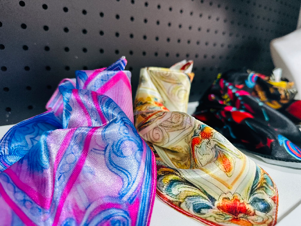 视觉传达设计专业杨雪梅小组设计的荆楚纹样系列方巾,以桑蚕丝为材,提取楚式漆器色彩、青铜器纹样等元素,经现代设计转译,形成五款各具美感的单品。“纹样源自曾侯乙墓青铜器上的蟠螭纹,色彩则融合楚漆经典色与当代流行色。”杨雪梅介绍,团队多次赴湖北省博物馆调研,解构传统图案,强化对称构图,让厚重青铜纹与轻盈凤鸟纹在方巾上和谐共生。