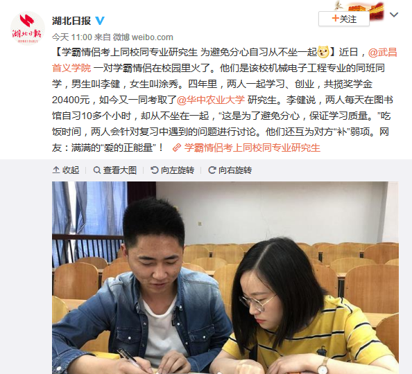 [湖北日报]学霸情侣考上同校同专业研究生