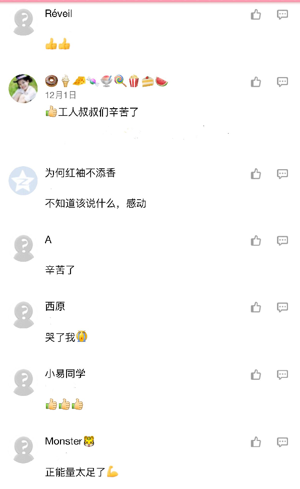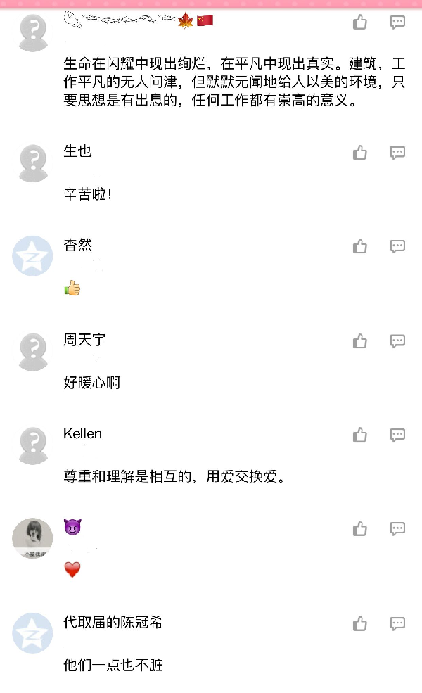 “现在回想起那一幕,依然非常感动!”焦丹说,人与人之间最重要的就是相互尊重,工友们虽然衣着比较脏,可是素质非常高,他们值得被尊敬。新闻专业1701班的李飘飘同学也在留言中写道:“建筑工人们一直默默奉献,为我们美化校园环境,我们应该向他们致敬,道一声辛苦了!”