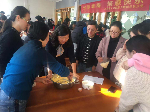 活动中,辅导员们分工合作,共同烘焙制作西点。校西点房糕点师鲁老师担任现场指导,为大家介绍、示范制作过程。随后,辅导员们开始动手制作。大家互相配合协作,和面、打鸡蛋、挤奶油、想创意,忙得不亦乐乎。大家一边操作,一边沟通,其乐融融,现场弥漫着浓浓的奶油香味。大家都享受着欢乐的烘焙时光,体验着合作分享的乐趣。合作完成的点心一出炉,就被分享一空。有的老师说:吃到自己亲手制作的小糕点,感觉味道美极了!