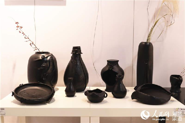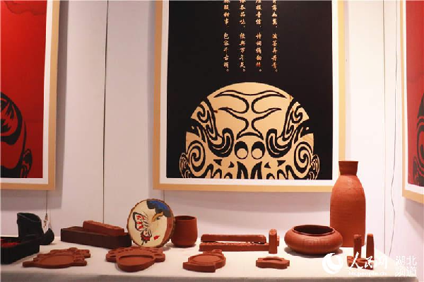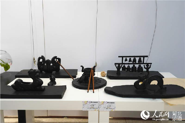被称为“四千年前地球古文明最精致之作”的黑陶,其色黑如浓墨,光亮如明镜,在学生的巧手之中,传统楚文化纹样被提炼优化,结合屈家岭的黑陶工艺,创造出编钟、凤凰、面具和青龙白虎的变体,将楚地风情展现得淋漓尽致。还有作品设计成活字印章,放置于同为黑陶烧制的屈家岭缩略地形图中,让参观者直观地感受屈家岭文化的悠久底蕴。