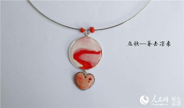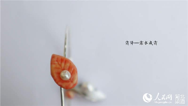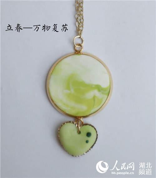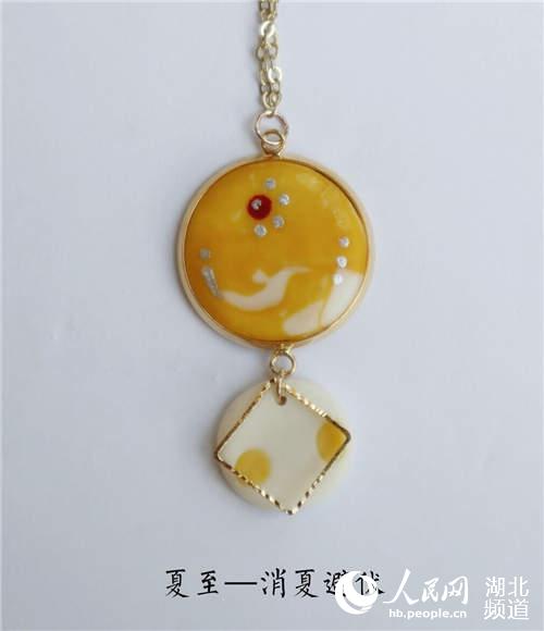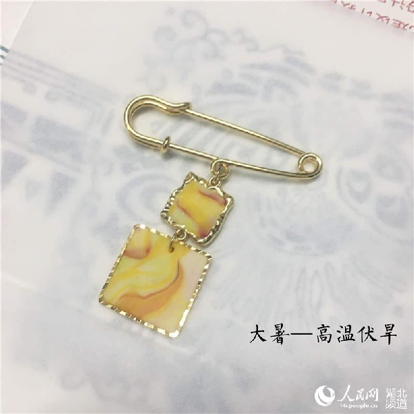 许欣雨还匠心独运为每一件首饰划定了一个有趣的主题。如“冬”系列中的六件作品就名为“立冬——万物收藏”、“小雪——腌肉习俗”、“大雪——腌菜习俗”、“冬至——阴阳至极”、“小寒——吃烤白薯”、“大寒——雪定丰年”。在表现“万物收藏”时,将耳环上花朵的花瓣设计成收拢的包状,在花朵的外部还裹这一层白色的陶泥象征着雪,冬寒刺骨、万物沉睡的主题呼之欲出。还有代表着小雪的“腌肉习俗”,化用雪花初落时家家户户腌肉度丰年的习俗,并创造性迎合了市场更受欢迎的食物系饰品,在深蓝色底托上放上一颗肉色圆珠,营造出雪中腌肉的画面感。