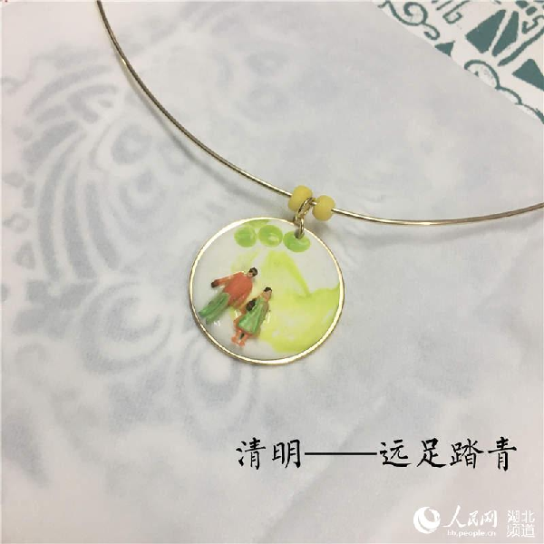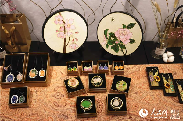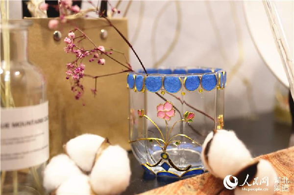 手机壳、收纳盒、书签、首饰、装饰画、玻璃杯……30余个文创设计作品全部融入景泰蓝工艺,精致细腻,绚丽多彩,将屈家岭本土的乡村文化、桃文化、鹿文化与之结合,绘以田园风光,置身于桑梓下原野中,尽显淳朴雅致。