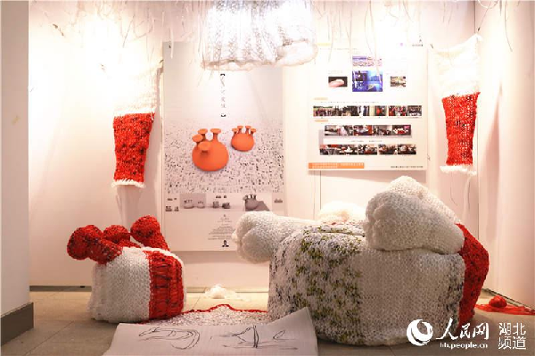 外形酷似珊瑚的懒人椅,形制独特的吊灯,作者杨俊杰告诉记者,作品是用了600多个塑料袋,花费了18天,整整216小时制作而成,他为作品取名为“墙”。