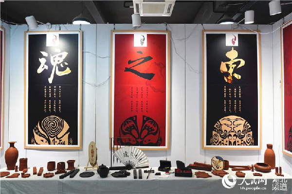 平面的海报与三维的工艺品都以经典的黑红搭配为主色调,同时融入京剧脸谱的元素,文创作品“魂之东方”吸引了众多观展者。展台上整齐而有规律的摆放着由黑陶烧制而成的陶艺品,以朱砂红与经典黑为主打色,两侧朱砂红的陶罐与红背景相呼应,又与背景黑对比,同时衬托着中间黑陶烧制的笔墨纸砚,以重点突出和表达“魂之东方”的主题。