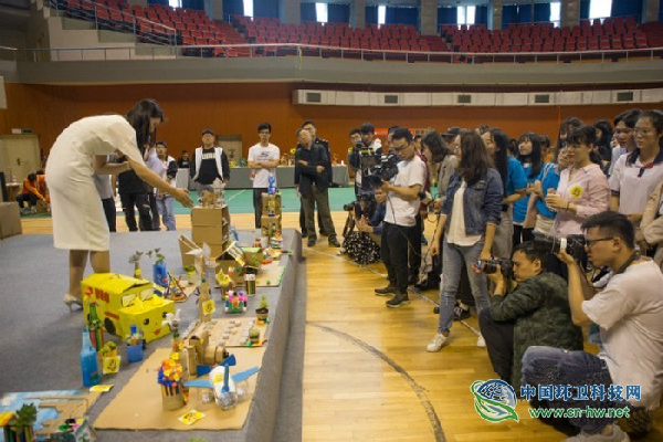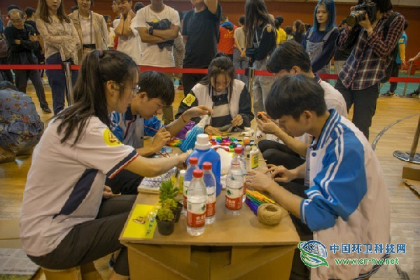 中国环卫科技网5月16日讯 “预备,开始!”随着裁判员一声令下,由社区居民、在校学子组成的9支队伍,立即拿起纸箱、胶带、矿泉水瓶等原材料开始创作。