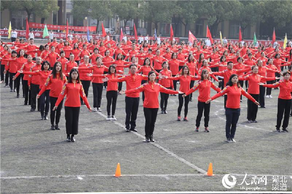 开幕式上,该校400名教职工代表身着红色运动服,齐舞《我和我的祖国》,场面恢弘,寓意颇丰。他们摆出了人浪、同心圆、2019、70等多个造型,献礼新中国七十周年盛世华诞。