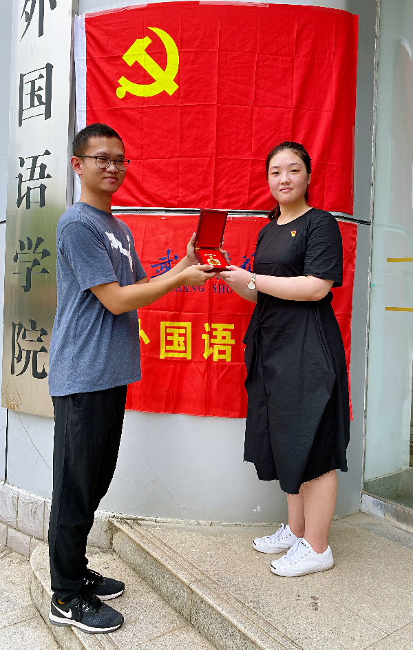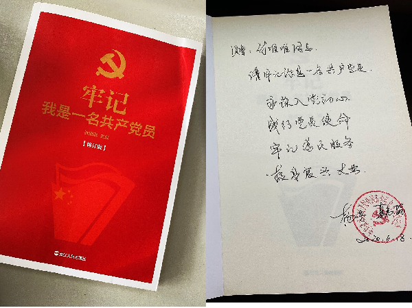 为毕业生党员赠送学习读本、佩戴党员徽章、举办入党宣誓仪式……这是该校外国语学院为返校的2020届毕业生党员们精心准备的“毕业礼”。19日上午,返校办理毕业手续的学生党员付唯唯收到了这份“专属礼”,她与另外3名学生党员一起,佩戴着党徽,站在党旗下重温入党誓词。宣誓结束后,该院学生党支部书记韩喆为她们送上了学习读本《牢记我是一名党员》,扉页上还有该院党总支书记杨芳亲笔书写的毕业寄语——“请牢记你是一名共产党员,永葆入党初心,践行党员使命,牢记为民服务,投身复兴大业。”