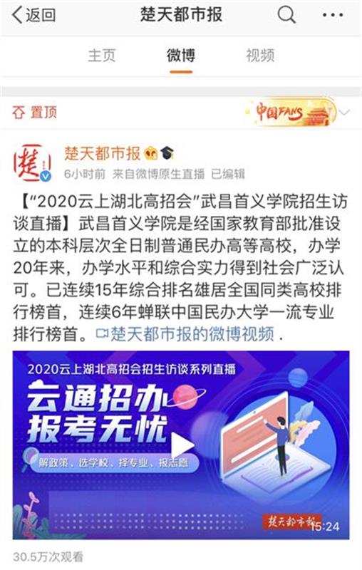 “2020云上湖北高招会”招生访谈内容将全程在楚天都市报官方微博进行直播,楚天都市报官方微信、今日头条号、“看楚天”新闻客户端、楚天视频等全媒体平台也将进行推送宣传。截至23日晚上10时,武昌首义学院招生访谈直播观看量已突破30万。
