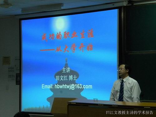 田博士强调,先富脑袋才能富口袋。成功的职业,一是靠个人的才华,即专业性人才,这取决于智商和天赋;二靠组织他人才华,即组织型或领导型人才,这取决于情商。但不管是哪一种人才,成才都不靠名校而是靠自己,故要坚持终身学习,内外兼修。在分析到当今教育体制和各种社会现状时,田博士以生动经典的案例鼓励大学生创业,同时提醒同学们“不是谁都可以创业”、“也不是什么时候都可以创业”,尤其是警示同学们要多考虑如何避免踏入创业陷阱。