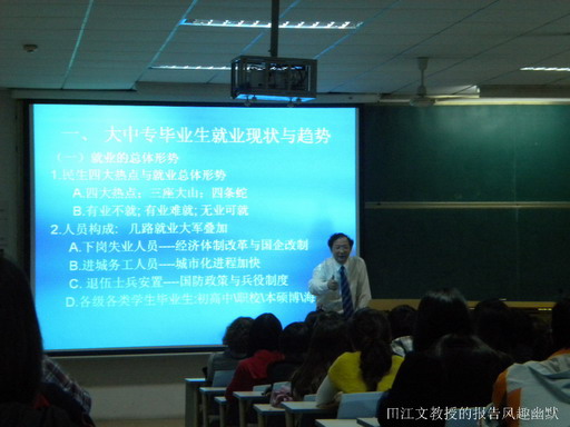 田文江博士诙谐幽默地给学生们分析了当前有业不就、有业难就、无业可就等就业现状,并用“微笑曲线”向同学们阐释了现在大学生就业呈现出的“两边高、中间低”的现象——重点大学学生和中职中专(有专门技能)的学生比较好就业,而二本、三本及大专学生的就业情况相对比较严峻。他说,市场上需要的是技术型、创造型人才,学校培养的是普通的劳动者,而社会培养的是老板。在一个谈论财富、梦想财富、创造财富的年代,在社会普遍就业困难的情况下,作为有知识、有理想的新一代青年,不但要有理想通过就业为社会创造财富,更要敢于通过创业为社会创造就业,进而创造更大的财富。