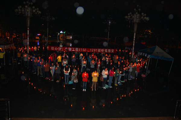21时,天空蒙蒙小雨,在司仪的简短介绍后,同学们一个接一个的捧着祝愿的蜡烛排成“