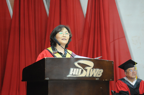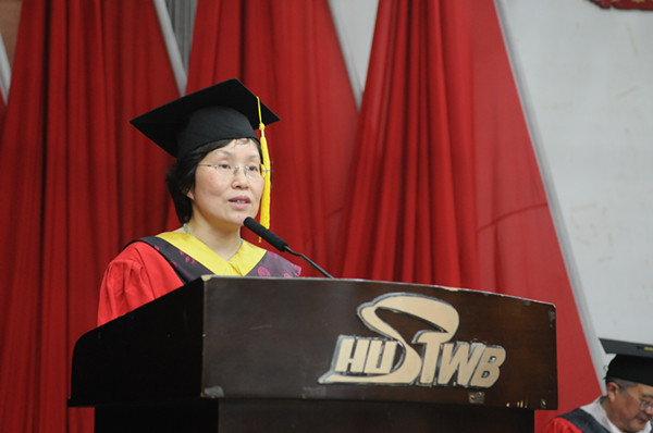 心怀中国梦,成就栋梁材。 “我们有这么多同学将进入社会,就业和创业,作为校长,作为你们的老师们,为你们所取得的成绩和出色的表现而感到骄傲”。周进校长继续说,2009年学校通过本科教学评估,2012年获得学士学位授予权,而且学校对大学英语等课程都实施了改革,今年6月英语六级的报考数首次赶超英语四级,这说明教学改革取得了一定成就,也是一个新的拐点。一所学校的“含金量”是由办学水平和向社会输送的人才质量决定的,我校走在全国独立院校的前列,众多毕业生更是以自己优良的素质得到了社会的认可,以自己出色的业绩,为学校赢得了众多美誉。她勉励大家:从今天起,站在一个新的高度来面对人生的旅途。面对困难不轻言放弃,并把加强修养作为毕生的功课。要时刻记住付出比索取重要,幸福比名利重要,事业比工作重要。站在中国梦的旗帜下,认真规划未来,追求卓越,迈向成功。愿大家都能够青出于蓝而胜于蓝,成为社会的栋梁之才。我们也期待毕业生有空常回母校看看。