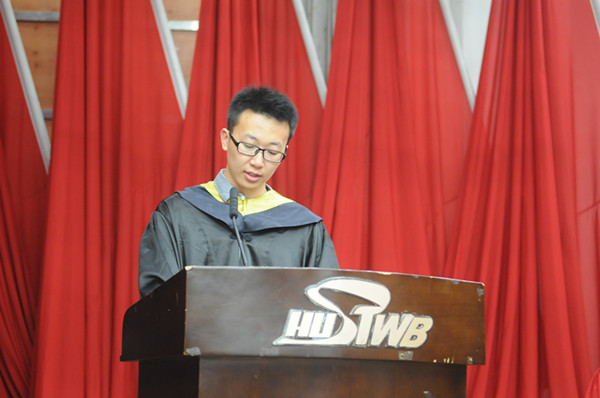 财务管理专业黄豆豆、机械电子工程专业董拓、土木工程专业杜捷、汉语言专业邵思巧扥四位毕业生分别发言。他们回顾了自己最宝贵的四年大学时光,对母校的栽培和师长的谆谆教诲表示感激,并有感于学校的快速发展,希望能用自己的拼搏进取换来母校的荣光,力求担当“今天我以华科大武昌分校为荣,明天华科大武昌分校以我为荣”。