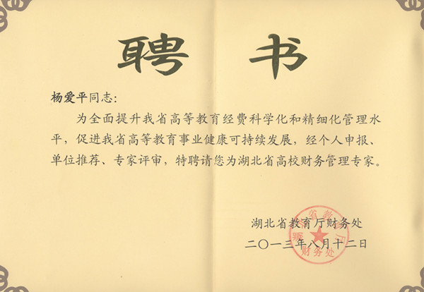 近日,财务处负责人杨爱平受聘省教育厅“湖北省高校财务管理专家”。