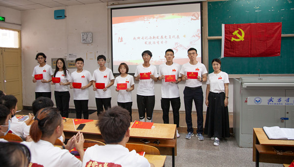 随后,李桂兰为教工党员佩戴党员徽章、发党章。赵瑜向新党员代表赠送政治生日卡。入党积极分子代表、电信1902班杨建涌,党员代表、计科1806班翟光远分别发言。他们介绍了自己在党史学习教育中的学习情况,号召全体党员和入党积极分子铭记党的光辉历程,发挥党员先锋模范作用,用实际行动向建党100周年献礼。