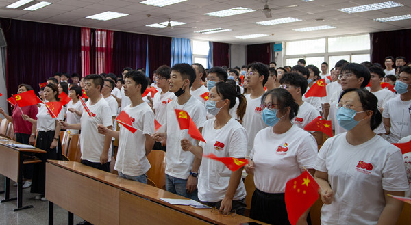 最后,在学生第四支部书记何青的领誓下,全体预备党员举起右拳、庄严宣誓,全体老党员重温入党誓词。大会在《没有共产党就没有新中国》的合唱声中结束。