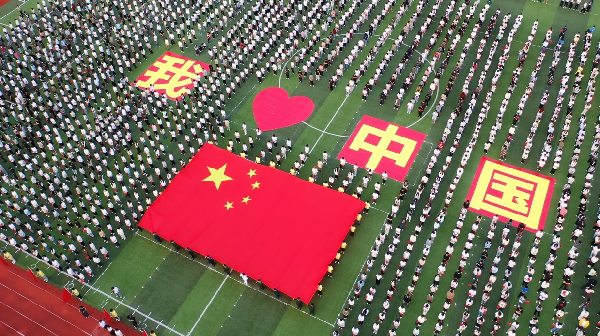 与此同时,在田径场中央,同学们高举巨幅五星红旗,象征五星红旗永驻心中,向中华人民共和国76周年华诞献礼。“我爱中国”“请党放心、强国有我” 的巨幅字样分外醒目,倾泻着学生把爱国心、强国志、报国行融入行动的坚定意志和坚强决心。