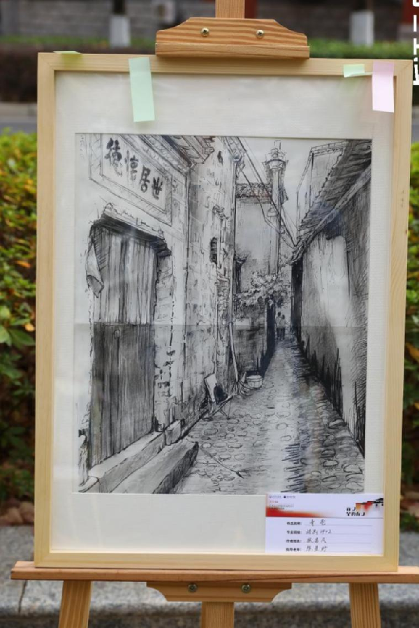本次展览共展出168件优秀作品,策展方别出心裁地采用卷轴、画架、立体装置等创意形式陈列,让画作与校园里的树木、走廊相映成趣,仿佛将观众直接带入蜿蜒古朴的江南巷弄。其中,作品《鱼趣》格外吸睛,作者以池中锦鲤为创作主体,巧用黑白对比与光影层次,在静态画面中勾勒出灵动生机,悠远意境引人无限遐想。展厅内,师生们或驻足品鉴,或交流构图巧思,现场氛围热烈。