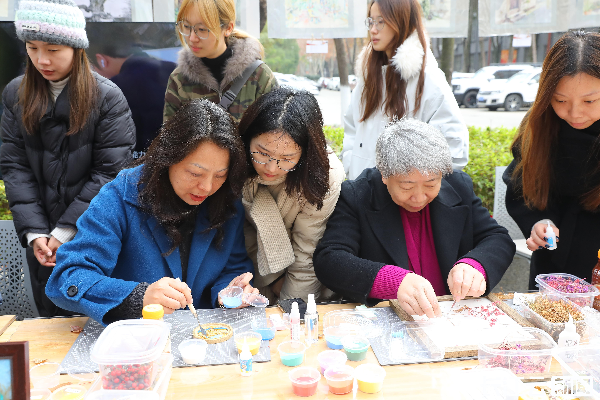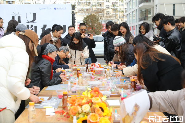 展览还特别设置“拾秋·手艺共创”互动体验环节。参与师生捡拾落叶、松果、树枝等自然素材,结合写生画稿,以掐丝珐琅非遗工艺进行二次创作,让江南意蕴在传统技法的加持下焕发出新的光彩。