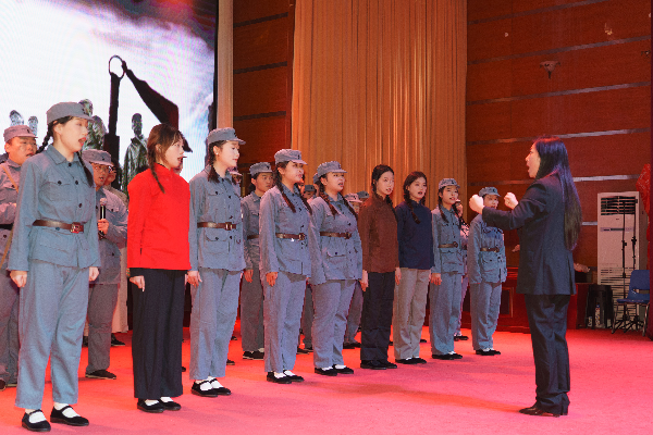 分享结束后,现场师生同上“山河回响,青春奋进”纪念中国人民抗日战争暨世界反法西斯战争胜利80周年思政大课,通过朗诵、舞蹈、合唱等艺术形式,重温中国人民抗日战争暨世界反法西斯战争胜利的壮丽史诗。情景朗诵《松花江上》让在场学子仿佛置身那段山河破碎的艰难岁月,舒缓地倾诉点燃了学子的爱国情怀。合唱《太行山上》激昂的歌声唱出抗日军民扎根太行、奋勇抗争的壮志豪情。舞蹈《黄河大合唱》以刚劲的肢体语言,展现了中华儿女“保卫黄河、保卫祖国”的坚定信念和不屈不挠、英勇抗争的精神。红色旋律响彻礼堂,全场大合唱《没有共产党就没有新中国》,师生们用最嘹亮的歌声唱响新时代的最强音。这堂思政大课带领师生穿越时空,重温了那段波澜壮阔的抗战历史,感受先辈们不怕牺牲的斗争精神、炽热的爱国情怀和坚定的理想信念,激励广大青年学生传承红色基因,勇担时代使命,在青春的赛道上奋力奔跑,以实际行动践行“请党放心,强国有我”的青春誓言。