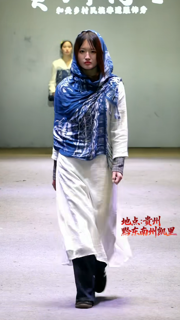 活动现场,学生们身着自己设计的贵州蜡染创意服饰,在“村T”舞台上款款而行。这些服饰既有苗族蜡染的靛蓝底色、经典纹样,又融入了荆楚文化的灵动元素——有的将楚式云纹与苗族蝴蝶纹交织,有的用西兰卡普色彩搭配蜡染肌理,每一件作品都展示着荆楚文化与贵州苗族蜡染技艺的跨界交融,也彰显出年轻一代的审美表达与创新活力。不少当地村民表示,这样的展演不仅让蜡染技艺更具时尚感,也让大家看到了非遗传承的年轻力量。