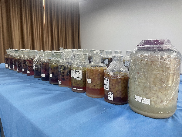 展台前,师生们品鉴不同风味的自酿葡萄酒和荔枝酒,并有不少老师现场咨询有关葡萄酒和荔枝酒的发酵、口感调和等制作工艺。本次展览负责人、生物工程2020级刘瑄对相关工艺进行了介绍:“我们制作时会先选好原料,然后再烘干酿酒瓶,装瓶时会分别在不同阶段装两次糖以及四次酵母,尽可能保证瓶中的糖和酵母与葡萄均匀混合,之后会进行密封发酵,最后才可以低温保存等待佳酿。”