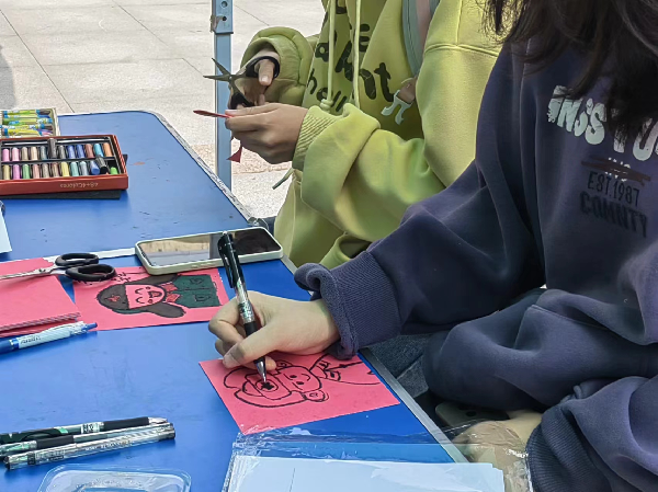 活动现场,青马会成员为同学们准备了硬卡纸、画笔、剪刀、胶水等各种材料。同学们或用画笔描绘雷锋肖像,或用剪纸剪出党徽等图案,亲身感受红色文化。
