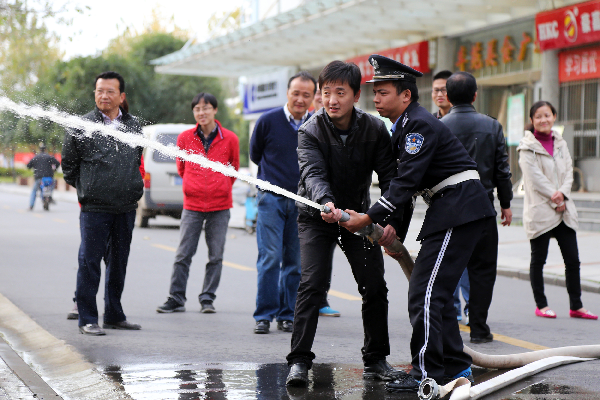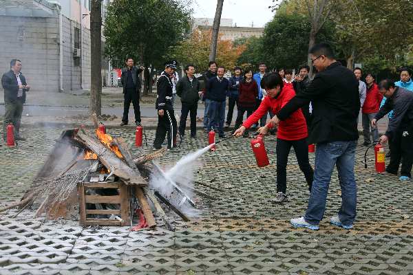 随后,在西区停车场,保卫处黄银章老师现场向图书馆工作人员讲解干粉灭火器的使用方法。“拔出保险销,按下压把,对准火焰根部进行扫射。”在他的指导下,图书馆工作人员两人一组纷纷拿起灭火器进行操作。黄银章老师还示范了如何正确使用消防栓。保卫处的消防队员铺开消防水带,打开消防栓后,一股高压水流喷出,迅速扑灭了远处的火苗。在场者按照指导亲身体验了消防栓的使用过程。