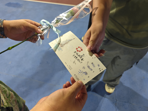 艺术设计学院开展了“礼赞教师节,情满秋意浓”主题活动,通过故事分享、手写贺卡、书记寄语等形式,向教师们致以诚挚敬意和节日祝福。在“以分享为桥,让心与心相遇”环节,张盼盼同学深情回忆了辅导员在她焦虑迷茫时主动谈心,用积极心态帮她化解难题的故事,并表示“这份不期而遇的关怀,是最珍贵的礼物。”杜旭、许方卓两名同学也分享了老师们为自己入团入党引路、为专业学习和就业指路的暖心故事。“一张贺卡,浓缩千言万语”环节,同学们在信纸和贺卡上写下对老师的深深祝福,未能到场的同学则通过视频录制,向老师们送上了节日的祝福。同时,同学们还充分发挥专业所长,以画笔为媒,绘制心中“书记”的形象,表达感恩之情。党总支书记吴世杰表示,艺术设计学院始终以美传递价值,老师们既是“播种者”也是“领航者”,要顺应数字化发展趋势,在教学创意、实践操作上深耕钻研,推动校企协同项目落地、“三下乡”乡村振兴等活动开展,将美的理念真正融入社区经济与乡村发展。在嘉鱼校区,2025 级新生精心策划了“鲜花赠教官”主题活动。活动中,新生们充分发挥专业优势与创意天赋,在贺卡上细腻勾勒出教官训练时挺拔的英姿、用鲜艳的色彩渲染出军训生活的活力、写下“感谢您的严格与温柔,祝您教师节快乐”“路上有您,我们更有力量” 等暖心话语。一张张精美的贺卡、一束束温馨的康乃馨,让这个特殊的日子充满了仪式感。