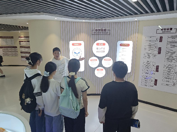学生们依次参观了“历史沿革”“科研突破”“育人成果”“社会贡献”等主题展区。一幅幅记录历史的老照片、一件件承载岁月的实物模型、一串串闪耀的荣誉数据,生动展示了学校发展脉络:从建校初期的筚路蓝缕,到如今在物联网、人工智能等领域的领跑地位;从一代代学者攻坚克难的科研故事,到无数校友投身国家建设的奋斗身影……学生们驻足凝视,认真聆听,感受学校深厚的文化底蕴。