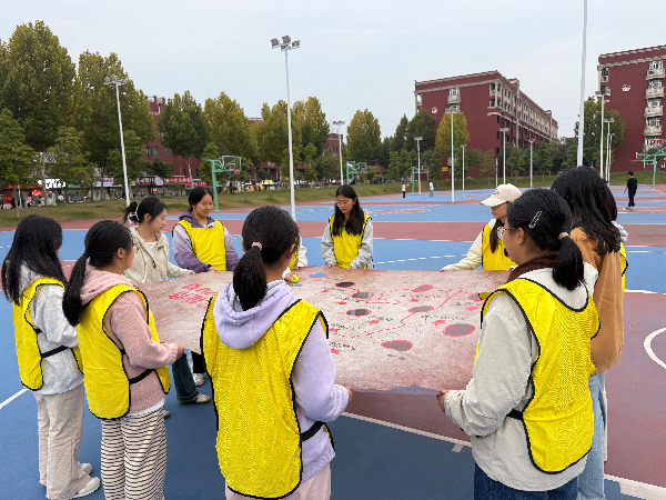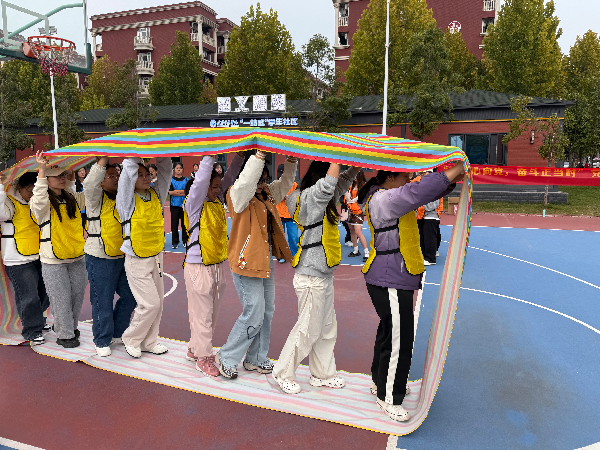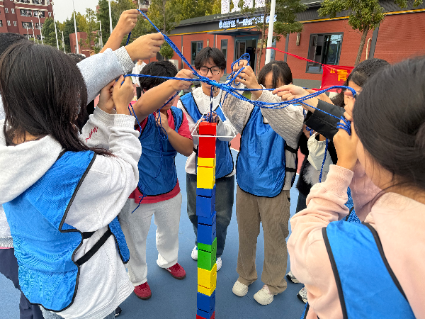 首个挑战“突破封锁线——重走长征路”项目,各队成员协作拉住长征路线图喷绘布,将象征“革命火种”的网球从“瑞金”安全运送至“遵义”,队员们屏气凝神、密切配合,确保“火种”不掉落,在紧张的氛围中完成了团队初磨合。随后的“飞夺泸定桥——合力建塔”项目,队员们借助绳索操控积木搭建“泸定桥”,在精准协作中比拼搭建速度与稳定性。“穿越草地——车轮滚滚”项目中,大家脚踩象征“生命之履”的彩带,以整齐步伐模拟“走出沼泽”,进一步强化了“步调一致才能得胜利”的团队意识。“红歌猜猜猜”环节,《东方红》《歌唱祖国》等经典旋律陆续响起,各队成员踊跃抢答,在红歌重温中回望革命历史,将红色记忆深植心间。
