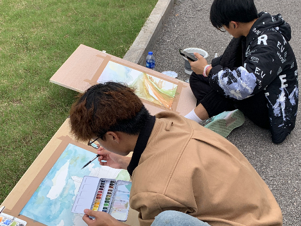 相较于校外写生,校园场景兼具熟悉性与多样性,既有规整的建筑几何线条,又有自然的植物肌理;既有晨昏光影的戏剧性变化,又有四季轮转的色彩叙事。设计类2505班王锶雨在写生创作时感慨:“走出画室,阳光穿过枝叶的斑驳、微风吹起涟漪,屏幕上的那些风景真实呈现在眼前,支起画板提起画笔,用眼睛捕捉光影流转,用心灵感受颜色差异,写生让我感受到了不同的校园,落叶飘下时的轻响、阳光落在身上的温暖、石头触碰的冰凉感,在落笔时才懂,绘画从不是复制,而是与天地万物的温柔对话,每一笔都藏着自然的馈赠与内心的悸动,将老师的悉心教导融入到对自然的感受中,这让我以另一种方式感受到了校园生活的美好。”