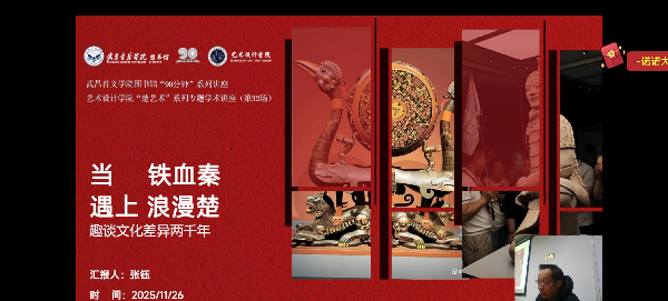为带领师生探寻秦楚文明基因,贯通古今启思当下,11月26日晚,艺术设计学院张钰副教授以“当铁血秦遇上浪漫楚——趣谈文化差异两千年”为主题开展了线上讲座,引导师生领略秦楚文化基因的碰撞与融合,为当代效率至上与人文关怀的平衡提供历史借鉴。