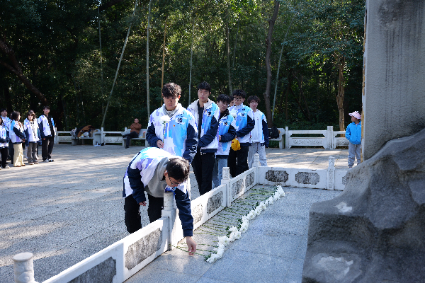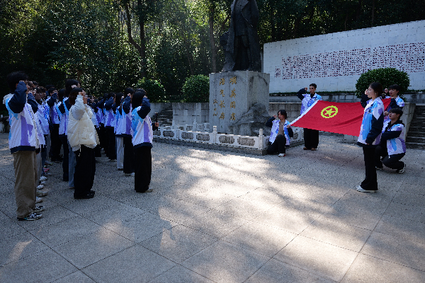 上午十时,同学们在项英同志雕像前举行了庄严肃穆的缅怀仪式。团学联组织部部长邱泽群带领大家重温了项英同志的英雄事迹。随后,全体师生肃立默哀,敬献花束,表达对革命先烈的深切缅怀与崇高敬意。新发展团员程慧燕围绕“从红色精神中汲取前行力量”与大家展开交流,并带领大家面向团旗庄严宣誓。铿锵誓言在山间回荡,展现了青年团员坚定的理想信念与责任担当。