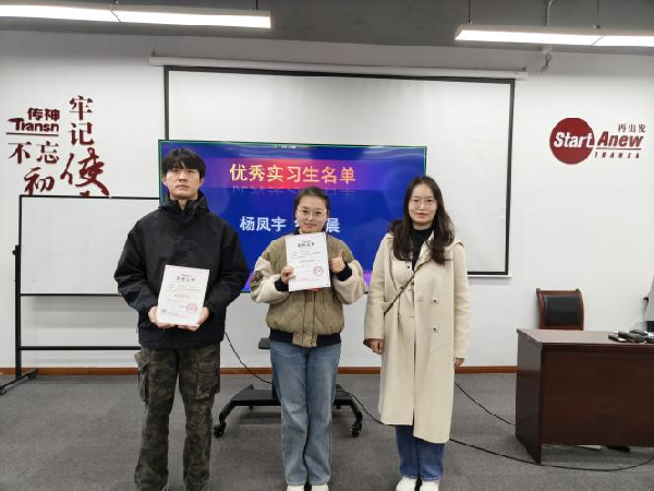 为表彰同学们实习期间的优异表现,传神语联网公司为全体同学颁发了实习结业证书,并特别为表现突出的学生授予了“优秀实习生”荣誉证书。