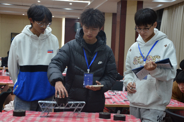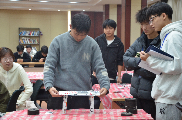 决赛共设“稳如泰山”“斤斤计较”“极限挑战”三个环节,从基础承重到效率竞争,再到极限考验,逐步考察模型的稳定性、轻量化设计与结构极限。晋级决赛的9支队伍经过层层选拔,在比赛中展现出丰富的结构创意与扎实的力学运用能力。参赛选手用普通扑克牌与胶水,采用三角形桁架体系提升整体稳定性,运用瓦棱柱结构增强局部抗压能力,构筑出形态各异、构思精巧的纸桥模型。随着砝码逐级加载,不少模型相继发生变形、塌陷或局部破坏,真实的“失效”场景不仅没有削弱比赛氛围,反而引发了师生对结构薄弱环节的即时探讨与反思。参赛选手在模型测试后分析道:“这让我们直观看到,理论上的完美设计必须考虑实际荷载的不确定性。”