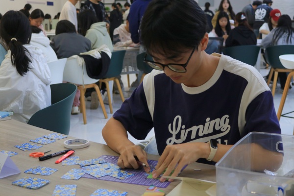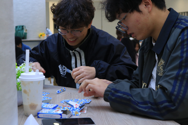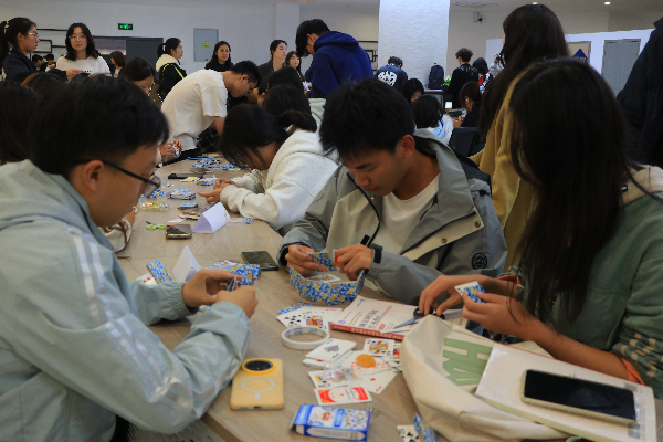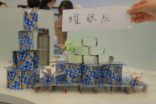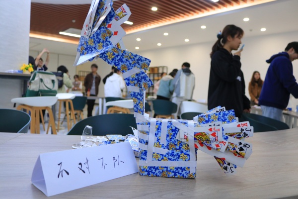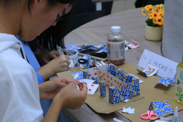 “纸构匠心”赛道中,参赛队伍需在40分钟内,仅使用扑克牌、双面胶等基础材料,设计搭建兼具承重性能与视觉美感的立体结构。比赛现场,各参赛队伍构思巧妙、操作娴熟,有的将纸牌折叠成三角棱柱,有的裁剪为蜂窝网格,有的卷制成中空圆柱,亦或采用镂空设计,在有限材料与时间内,充分展现了对结构力学知识的理解与运用能力。当轻巧的纸牌结构成功托起厚重书本、哑铃片乃至整桶饮用水时,现场不时响起阵阵惊叹,氛围热烈。