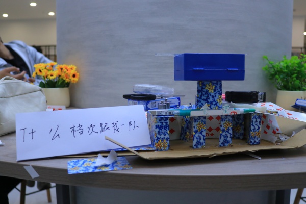 “科创共筑”赛道则聚焦废旧材料再利用,各参赛队伍展示的作品兼具环保理念与工程智慧。从智能避障小车、太阳能供电系统,到瓦楞纸台灯、废品坦克模型,一件件作品将环保意识融入科技创新实践。其中,“你们做的都不队”制作的智能环保小车采用STM32芯片实现精准避障,凭借新颖的设计与实用的功能,被誉为“会思考的环保使者”,充分彰显了学子的科技创意与动手能力。