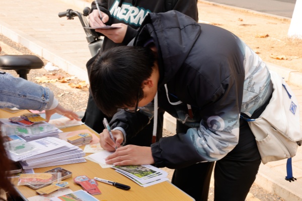 活动现场秩序井然,同学们可自由领取明信片,或写下对春天的浪漫寄语,或记录2025年校园生活中的“高光片段”与“情感切片”。完成书写后,大家附上个人联系方式,将明信片投入专属存档箱。所有参与者均获得了纪念礼物,这份小小的纪念品,既是对参与者的肯定,更是对青春真挚心意的珍视。该存档箱将于明年此时启封,届时同学们可重温过往文字、检视自身成长轨迹。
