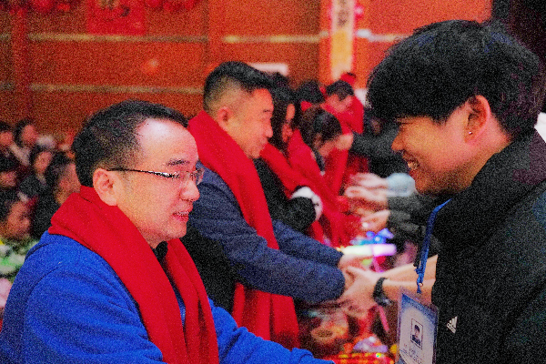 晚会伊始,温情的“谢师仪式”瞬间将现场氛围点燃。16名学生干部手持红色围巾,从舞台两侧缓步走向前排嘉宾老师。红色围巾象征着学子们炽热的感恩之心与师生们的深厚情谊。学生干部向老师们鞠躬致谢,为老师们系上围巾,随后,在主持人带领下,全场近千名同学齐声喊道“老师您辛苦了!”这一刻,现场温情满溢,掌声雷动。师恩如灯,师情似海,这份师生情谊在红围巾的映衬下愈发醇厚绵长。