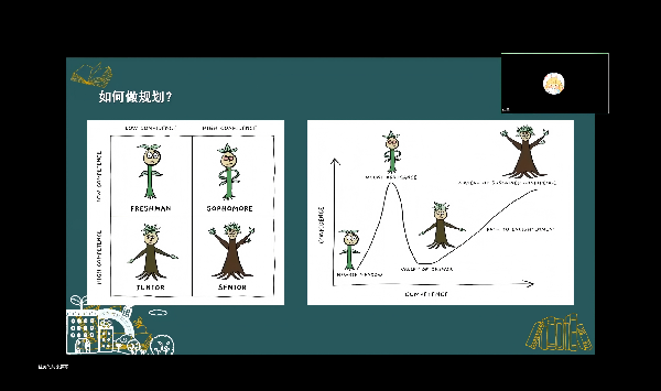 会上,曹苗佳美首先作了“大学四年规划”专题讲座。讲座强调了规划在大学阶段的关键作用,指出系统的规划能帮助同学们清晰每一步该学什么、练什么,从而实现从“被动适应职业”到“主动设计职业”的转变。曹苗佳美进一步分享了职业规划的具体方法,涵盖教育背景、内在动机、阶段目标、资格积累与定期检查等核心环节,鼓励同学们踏实走好大学的每一步。针对大学生活的构建,她提出了四个维度的全面成长框架:课业是专业立身之本,需扎实掌握核心内容;课外活动能有效培养组织协作与实践能力;体能健康是革命的本钱,应培养可持续的运动爱好;人际关系则需要学会沟通、包容与经营。她强调,这四个维度相互关联、彼此促进,共同绘就大学生活的完整图景。