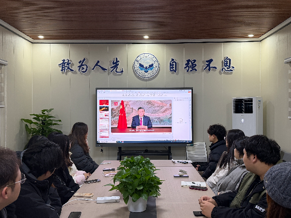 活动伊始,全体党员肃立奏唱国歌,面向党旗重温入党誓词。铿锵有力的誓言,既是对过往初心的回望坚守,也为新一年的奋进之路筑牢信仰根基。学习环节,学生党员们认真观看了习近平总书记2026年新年贺词视频,集中研读了新年贺词内容。贺词全面回顾了过去一年党和国家事业取得的重大成就,立足“十五五”开局的历史节点,对新一年的发展作出了战略指引、寄予了殷切期许,字里行间充满着深厚的人民情怀,凝聚着昂扬的奋进力量,为广大党员和青年学子锚定了前行航向、注入了蓬勃动能。