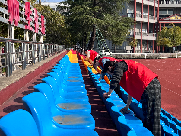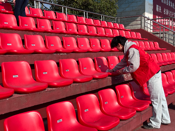 阳光温柔地洒在整齐排列的座椅上,红马甲的身影与多彩的看台相互映衬,构成了一幅充满活力与温暖的画面。原本蒙尘的座椅在志愿者们的精心擦拭下焕然一新,散落的杂物被彻底清理干净,观众席恢复了整洁舒心的模样,仿佛在诉说着这场志愿活动的意义与价值。在这个过程中,志愿者们不仅用双手美化了校园环境,更在协作中加深了彼此的友谊,在奉献中深刻体会到责任与担当的分量,青春的朝气与善意如潺潺溪流,在校园的每一个角落静静流淌。