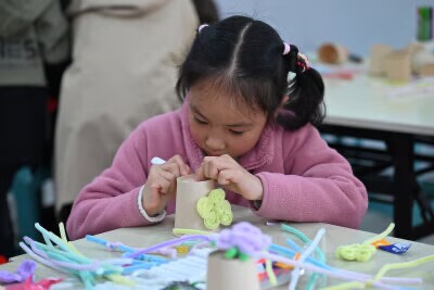 随着课堂知识的铺垫,活动进入了令人期待的手工环节。志愿者们首先化身创意导师,示范了纸杯创意笔筒、手绘纸杯、扭扭棒盆栽等一系列环保作品的制作过程。他们一边操作,一边清晰明了地讲解每一个制作步骤与技巧,让孩子们能够轻松跟上节奏。孩子们听完后,眼中闪烁着兴奋的光芒,纷纷自由选择自己感兴趣的项目,迅速投入到创作之中。在志愿者们耐心细致的指导下,孩子们充分发挥想象力,用画笔在纸杯上精心勾勒出一个个可爱的卡通形象,仿佛赋予了纸杯新的生命;用彩色扭扭棒巧妙缠绕,一朵朵栩栩如生的花朵与枝叶在指尖绽放。原本废弃的材料,在孩子们的巧手下,摇身一变成为了独一无二、充满创意的手工艺品。过程中,孩子们不仅锻炼了自己的动手能力,更在相互分享创意、协作完成作品中,深化了对“循环利用”环保理念的理解。