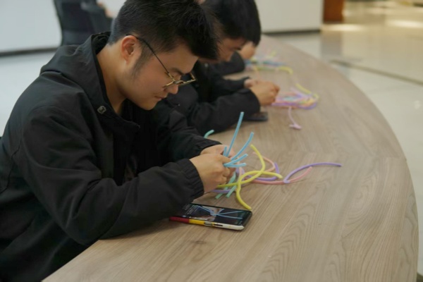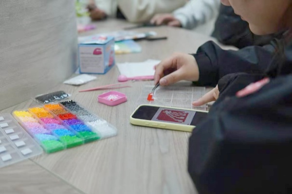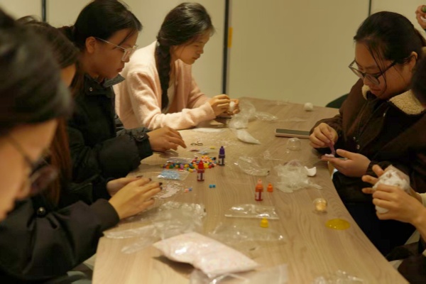 解压扭扭棒区域则成为创意迸发的乐园,色彩缤纷的扭扭棒在同学们手中自由弯曲、缠绕、拼接,灵动的小动物、精致的小花环等造型接连呈现。坏心情随指尖的创意变化逐渐消散,欢声笑语间,同学们的情绪得到有效释放。乐趣拼豆区域里,同学们沉下心来,将一颗颗小拼豆精准排列,用不同色彩拼凑出专属图案,从简单的星星到复杂的卡通形象,每一步操作都细致投入。当完整图案成型时,治愈感与成就感瞬间满溢。财管专2405班王茹炎分享道:“看着自己拼的小图案,突然觉得生活里的小确幸也很珍贵。”