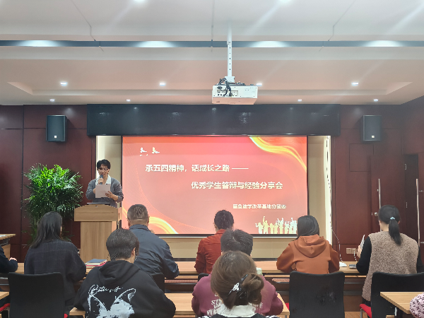 为传承五四精神,展现新时代青年风采,搭建优秀学子交流成长平台,4月9日晚,由嘉鱼基地分团委主办的“承五四精神,话成长之路——优秀学生答辩与经验分享会”在行政楼301报告厅举行。来自各学院的15名优秀学生代表依次登台分享成长故事,畅谈奋斗感悟。嘉鱼基地党总支副书记张冬、张晶、秦琦,分团委书记刘欣,学生管理科科长占威参加活动。