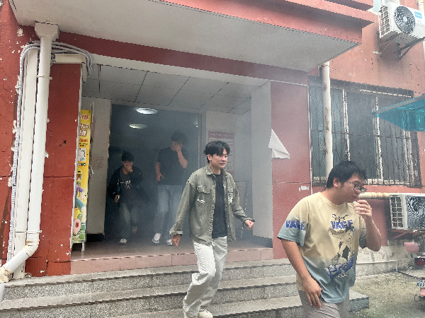 随着急促的消防警报声响起,演练正式开始。模拟火情设定在南区12号公寓1楼。楼内学生在各楼层疏散引导员(辅导员和学生骨干担任)指引下,迅速反应,严格按照“弯腰、低姿、捂口鼻”的逃生要领,用湿毛巾捂住口鼻,沿着预定疏散通道快速、有序地向公寓楼外安全集结区域撤离。整个过程紧张有序,所有学生仅用时三分钟就安全抵达指定集合点。